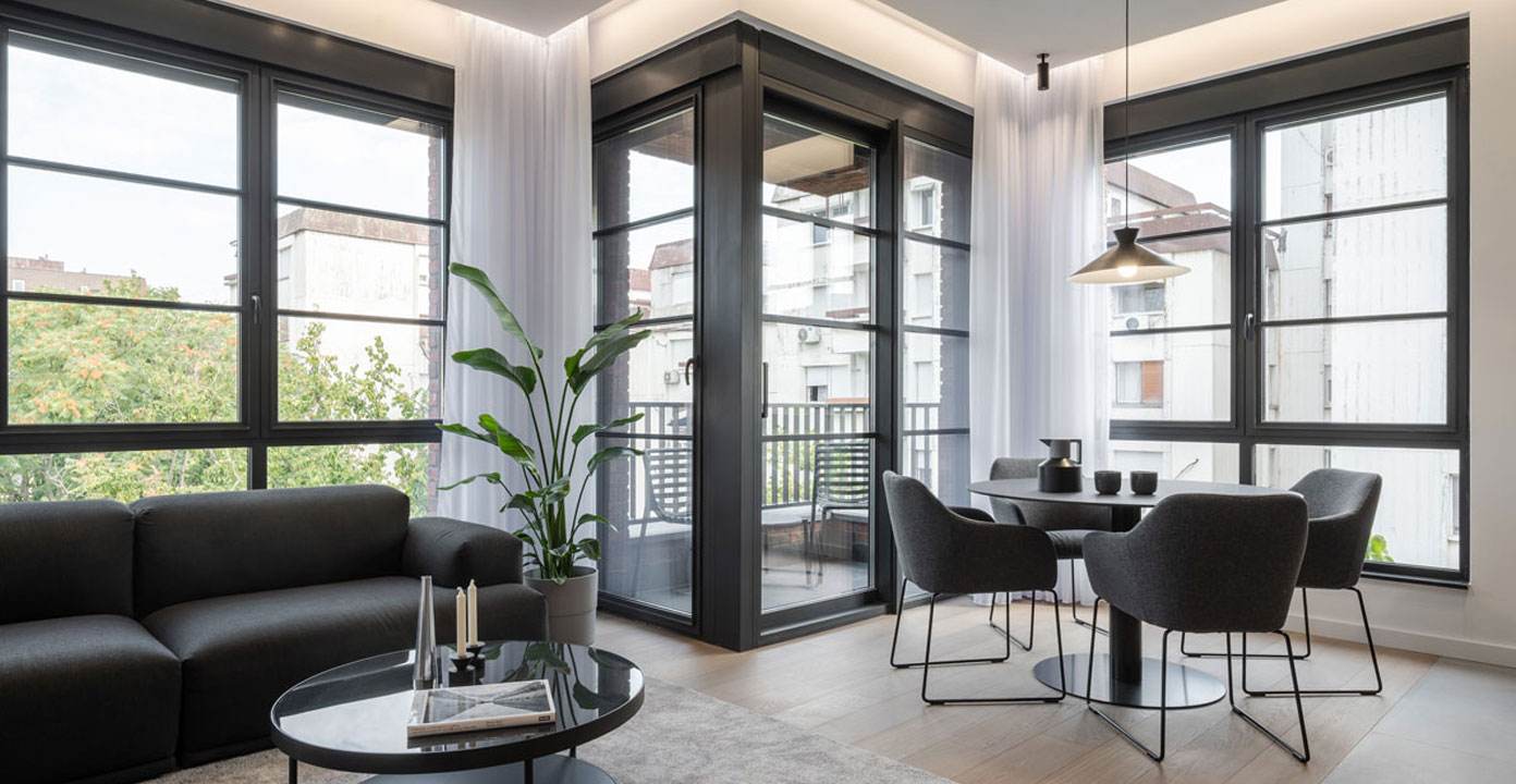 Poseban doprinos prostoru daje terasa koja je okrenuta ka zelenilu, a čiji veliki stakleni portali omogućavaju obilje prirodnog svetla. Na taj način se vizuelno briše granica između enterijera i spoljašnjeg prostora te stan funkcioniše kao produžetak urbanog pejzaža.